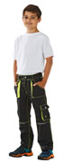 Kinder-Bundhose, 65% Polyester /35% Baumwolle, ausgestattet mit Reflexbiesen aus 3M Scotchlite, für gute Sichtbarkeit, verstellbarer Gummizug im Bund, 2 Vordertaschen, 2 Gesässtaschen. 1 Oberschenkeltasche mit Patte und Druckknopf links, doppelte Metertasche.