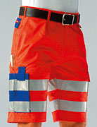 Shorts EN20471, 60% Baumwolle / 40% Polyester, 3-Nadel-Verarbeitung, mit verdecktem Reissverschluss, 2 Seitentaschen, 2 Gesässtaschen, 1 Schenkeltasche, 1 Nateltasche, doppelte Metertasche, Hammerschlaufe und Schlüsselring.