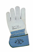 Schutzhandschuh aus solidem, grauem Rindsspaltleder, Finger und Handrücken bis hinter Knöchel aus Leder, Pulsschutz, eingenähter Gummizug, gummierte Stulpe, Handflächenfutter. EN 388